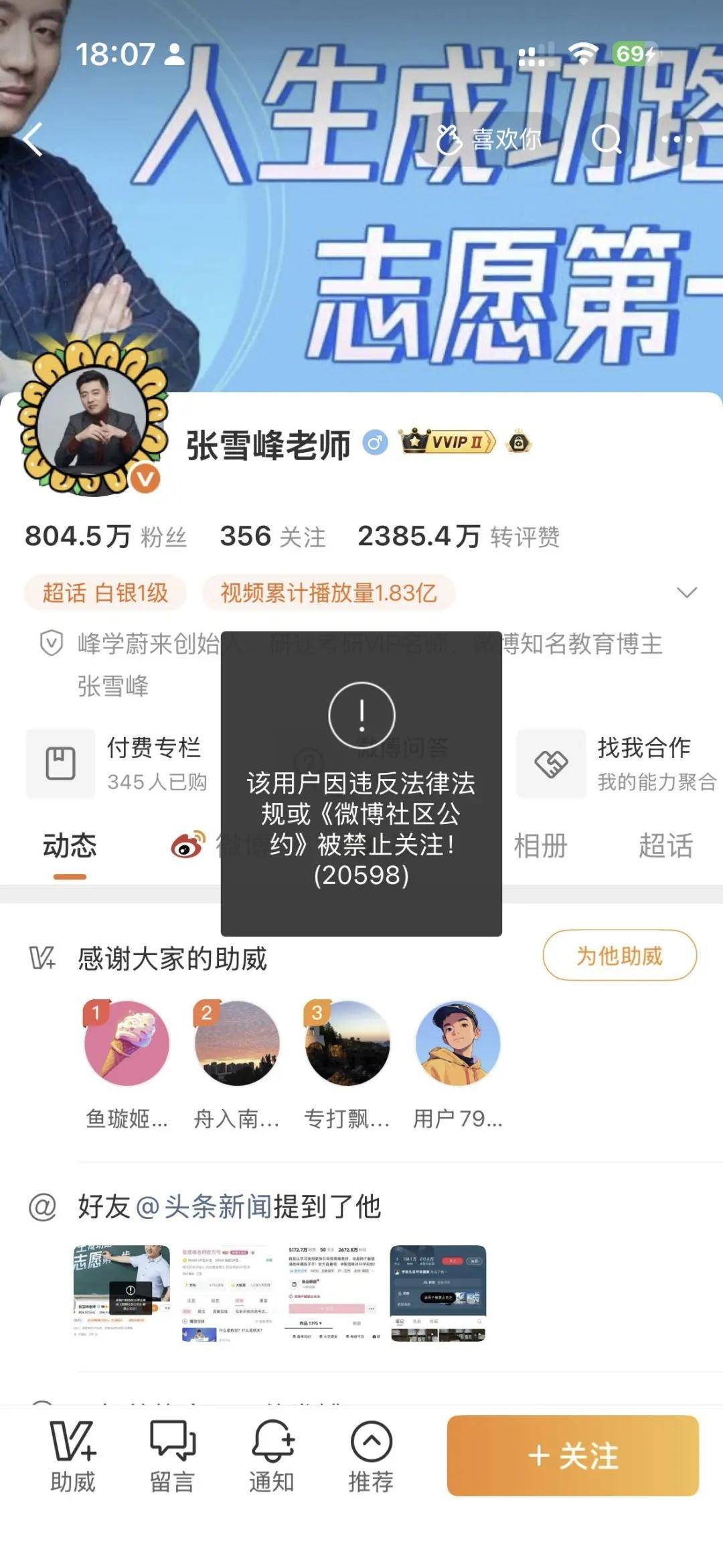 9月24日,全网粉丝近四千万的博主张雪峰多平台账号被禁,他过去靠着精准踩中教育焦虑的痛点和直言不讳的风格走红,但因“哈理工狗屁都不是”文科专业总结成一个字就是舔”“孩子非要报新闻就打晕”等言论被指责煽动就业焦虑和学科歧视,高价的志愿咨询服务已然背离了最初教育科普的初心。