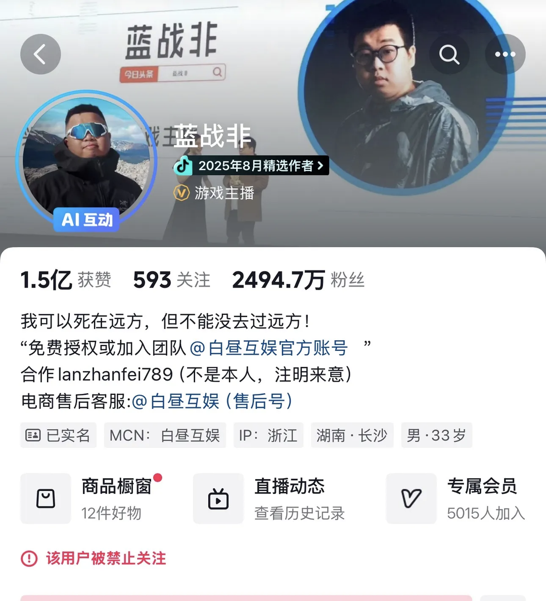9月25日,全网粉丝2400万的博主蓝战非账号也被禁,在他账号被封禁的前几日,其此前直播中自曝有上亿资产,“一年9位数,小看我了。”引发舆论批评,被认为是炫富拉仇恨。